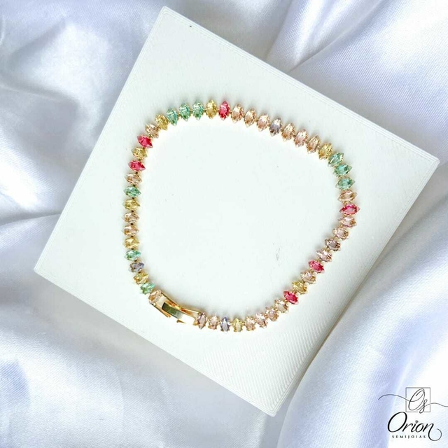 Pulseira feminina com 49 pedras zircônia colorida e fecho gancho, medindo aproximadamente 19,5cm.